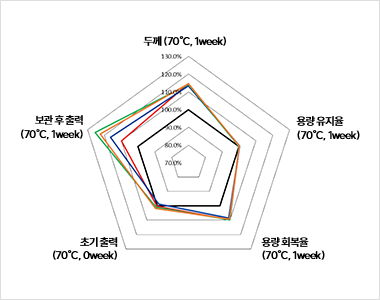 - 배터리 적용 시 가스 저감 효과를 보이며 고온에서의 출력 테스트 결과 성능이 향상됨을 확인.